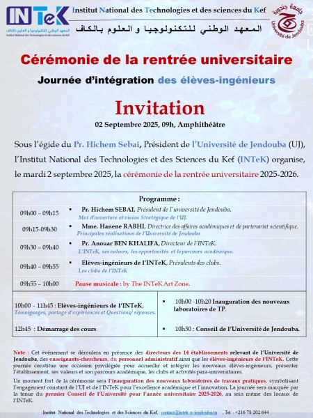 تحت إشراف الأستاذ هشام السبيعي، رئيس جامعة جندوبة، ينظم المعهد الوطني للتكنولوجيا والعلوم بالكاف يوم الثلاثاء 2 سبتمبر 2025، حفل افتتاح السنة الجامعية 2025-2026.