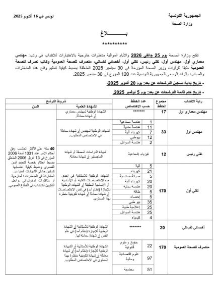 Le Ministère de la Santé ouvrira, à partir du 25 janvier 2026 un concours externes sur épreuves pour le recrutement des ingénieurs principaux, technicien principal, technicien supérieur, psychologue spécialiste, administrateur de la santé publique, et rédacteur en gestion de la santé publique, et ce, conformément aux arrêtés du Ministre de la Santé en date du 30 septembre 2025, fixant les modalités d’organisation et d’ouverture de ces concours, publiés au Journal Officiel de la République Tunisienne n°120 du 30 septembre 2025.