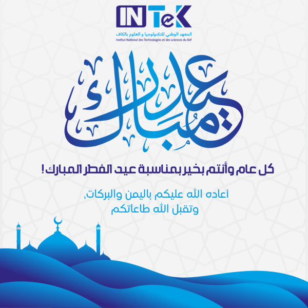 إدارة المعهد الوطني للتكنولوجيا والعلوم بالكاف بأصدق عبارات التهاني وأطيب الأماني إلى كافة الأساتذة، والطاقم الإداري والتلاميذ المهندسين، راجيةً من الله أن يعيده على الجميع بالصحة والعافية واليُمن والبركات.