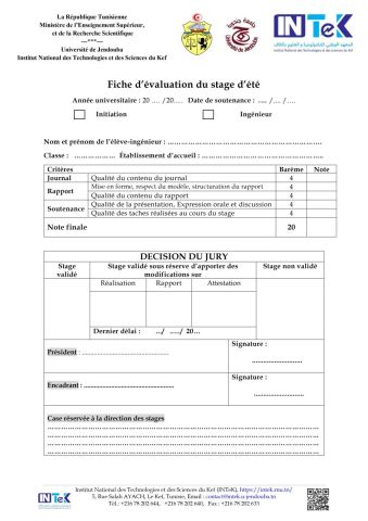 - Un jury d’évaluation des stages est désigné par le directeur des stages. La date de la soutenance des stages, la salle, le jury désigné sont donnés également dans l'espace Extranet.